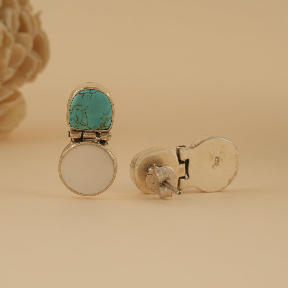 Turquoise studs paired with a mother of pearl disc, connected with a smooth hinge for gentle movement. Elegant, lightweight, and easy to style, they work beautifully with both Indian and Western outfits.
