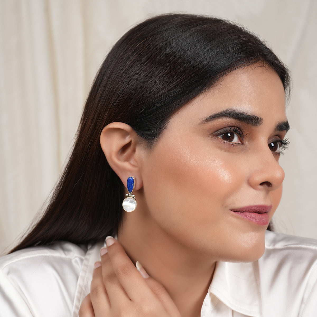 These silver drop earrings feature a blue lapis teardrop paired with a mother of pearl disc, connected with a smooth hinge for gentle movement. Elegant, lightweight, and easy to style, they work beautifully with both Indian and Western outfits.