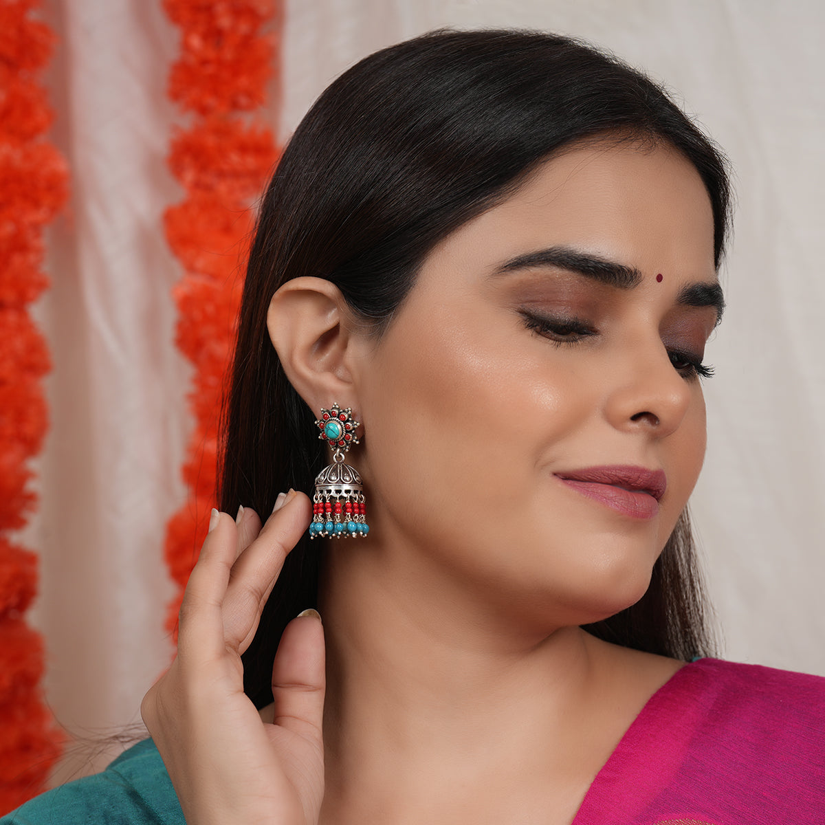 These 925 sterling silver jhumkis are crafted in a timeless silhouette, celebrating traditional Indian jewellery techniques with refined detailing. Featuring Coral & Turquoise floral stud tops and graceful bead drops, designed to be lightweight, elegant, and effortlessly wearable for festive occasions and everyday ethnic styling.