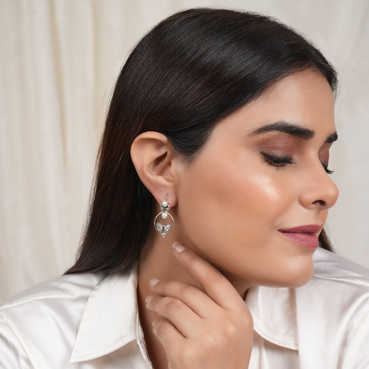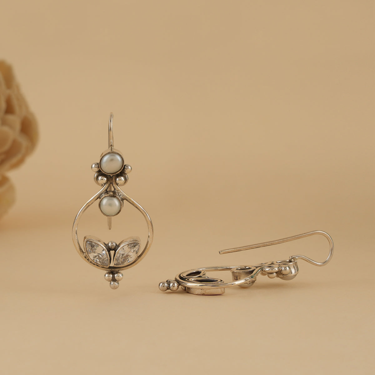 The Chandrika Pearl & Zircon Earrings feature a crescent design highlighted with subtle zircon sparkle and pearl details. Elegant and lightweight, they’re perfect for adding a classic touch to both festive and everyday looks
