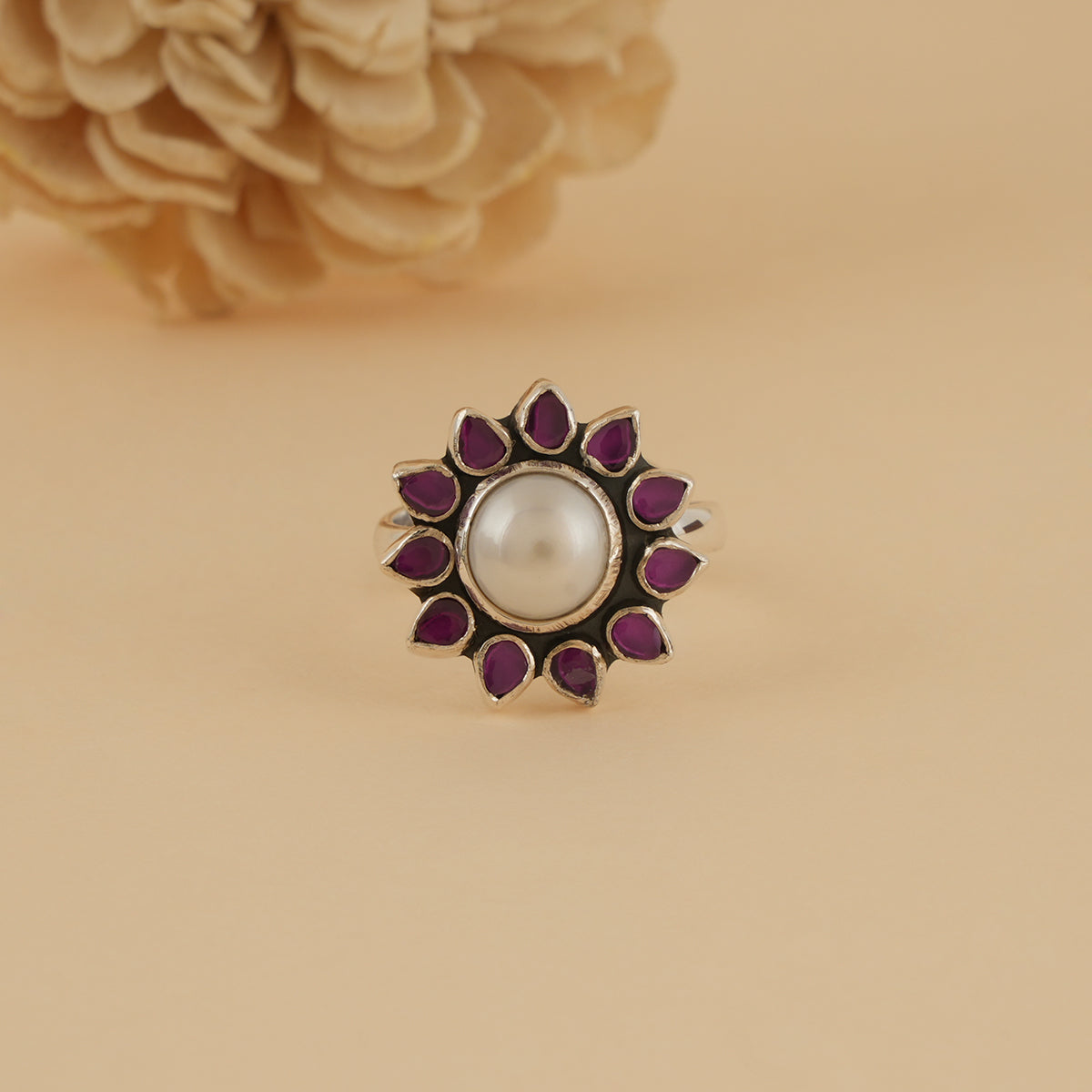 A pretty ring that adds instant charm to your look. It features a glowing pearl at the center, surrounded by deep ruby-hued zircon petals for a floral touch. Set in silver with an adjustable band, it’s easy to wear and perfect for everyday style or special occasions alike.