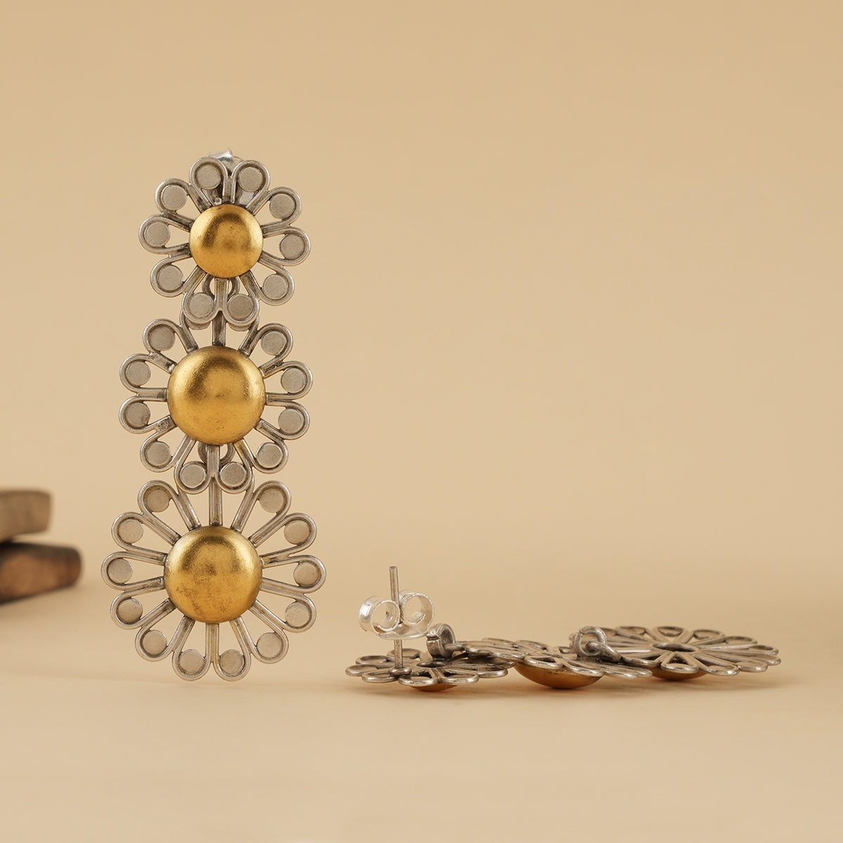 Dual-tone earrings featuring stunning three-layer floral design. Handcrafted in 92.5 Silver with a touch of gold, they strike the perfect balance between elegance and statement style — ideal for festive occasions.